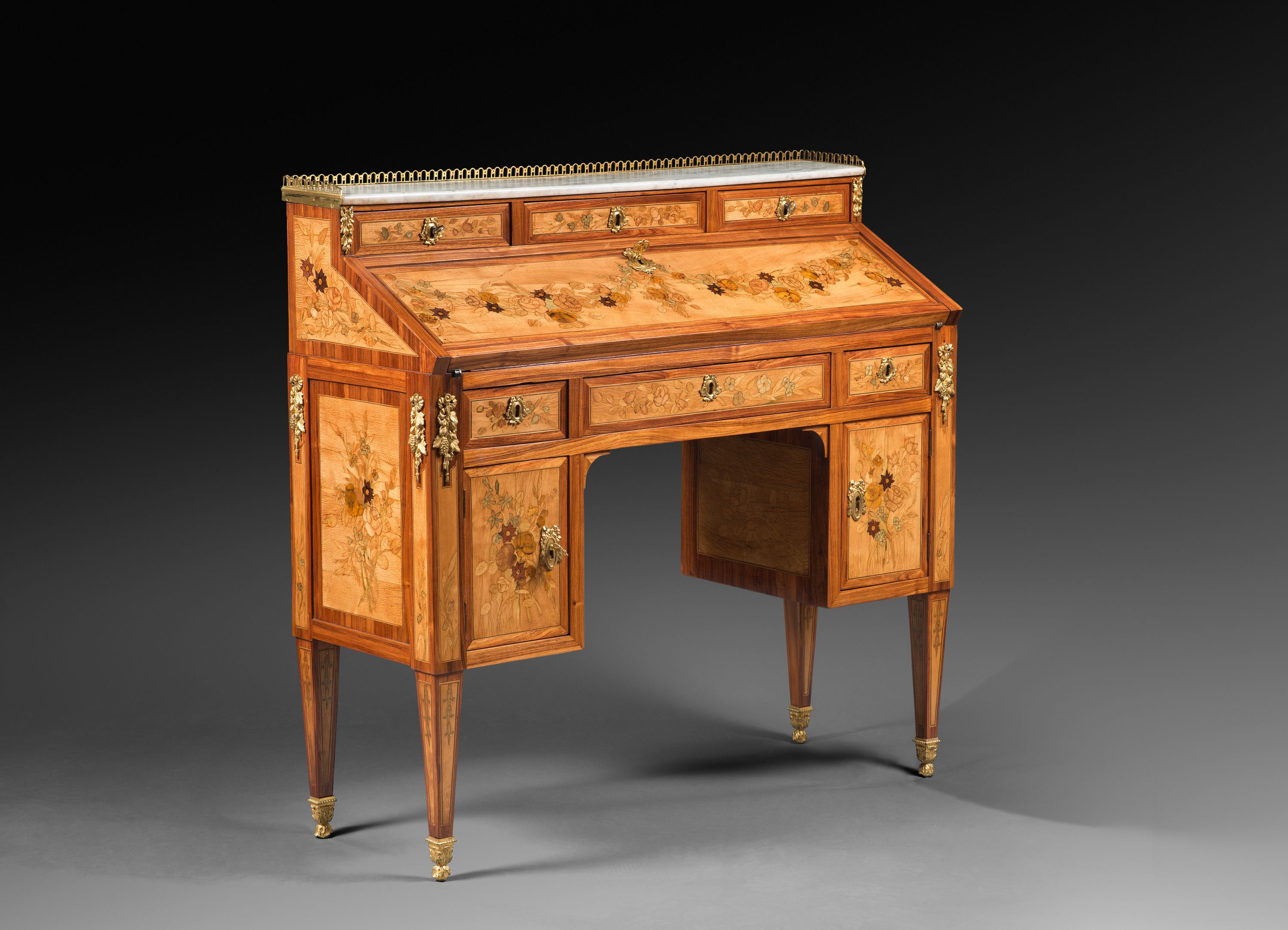 ?De forme rectiligne reposant sur quatre pieds gaines, il ouvre par trois tiroirs en ceinture et deux caissons à porte, l’abattant découvre deux casiers et quatre petits tiroirs, il est surmonté d’un gradin ouvrant par trois tiroirs, orné d’un marbre blanc veiné ceint d’une galerie ajourée.