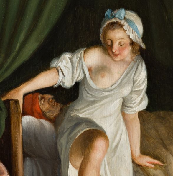 Pierre-Antoine Baudouin (1723-1769) élève de boucher, il connut un succès foudroyant en produisant des gouaches dont les sujets recoupent ceux de la littérature libertine. Ses scènes de séduction érotique sont proches des romans de Crébillon (1707-1777), de la Morlière (1719-1785)