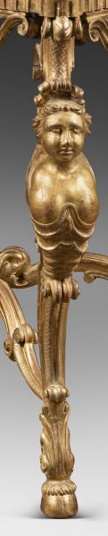 ?En bois sculpté et doré, la ceinture et les côtés ornés d’un motif de lambrequin central décoré d’un mascaron à tête de femme sur fond de croisillons. Elle repose sur quatre pieds très cambrés surmontés d’un buste féminin terminés par des sabots et une feuille d’acanthe. Dessus de Jaspe de Sicile