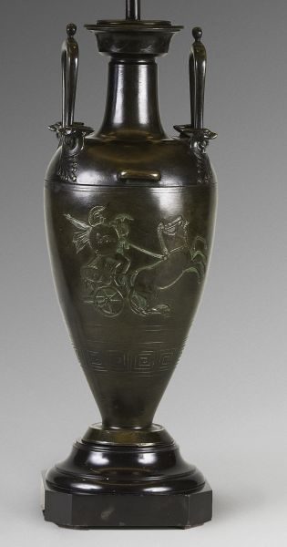 In patinated bronze, decorated on its body with scenes inspired by Antiquity, a chariot harnessed to two rearing horses led by a charioteer, leading a warrior into battle, both wearing a Corinthian helmet, on the other side, a rider fighting a foot soldier, a frieze of Greek underlines the scene. On the shoulder two small horizontal handles and two vertical handles more important imitating the shape of a spur, two stylized wolf heads at their base.